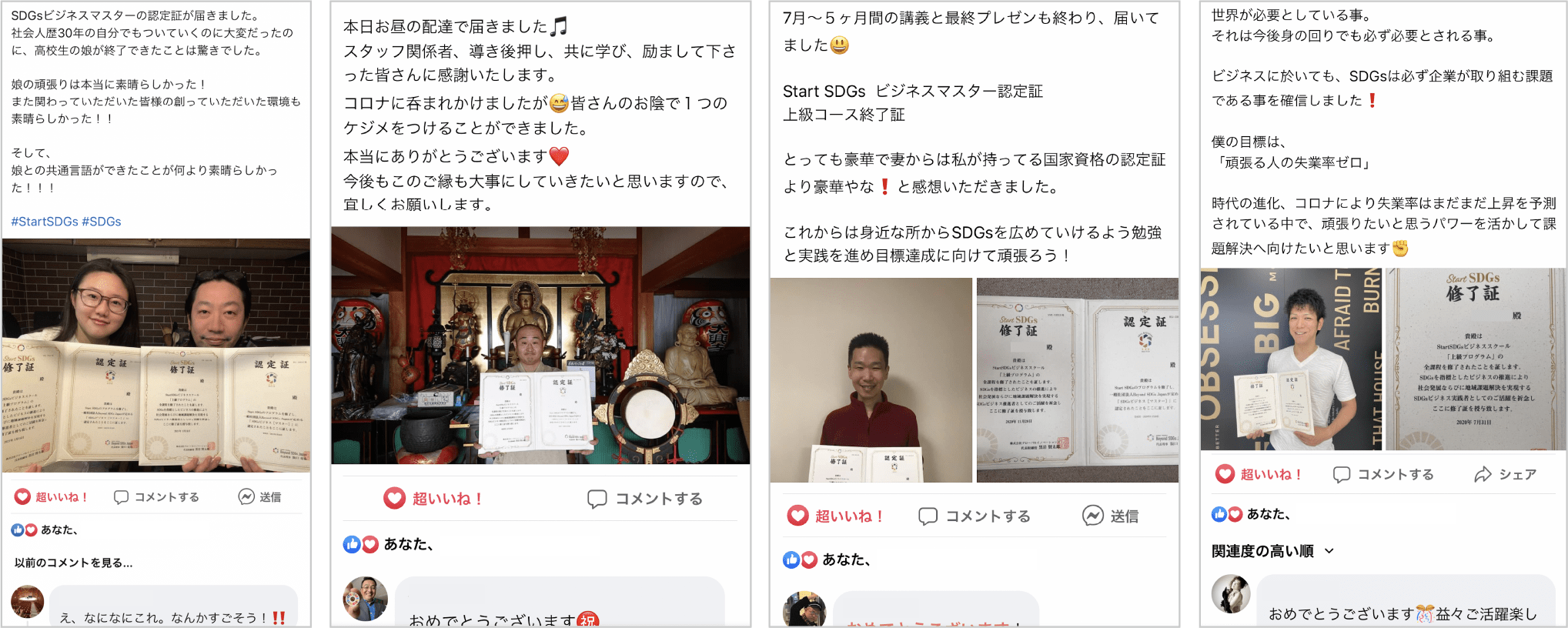- StartSDGsは、何かを相手に「あげよう、協力しよう」という方が多いGIVERのコミュニティです。皆が与えようとしてきてくれるので、自分も同じようにGIVERになれます。また、期を跨いだ交流、コミュニケーションが可能で、修了後も積極的に交流を続けていた結果、同期の方とパートナーシップ組んでビジネス展開へと繋がりました。